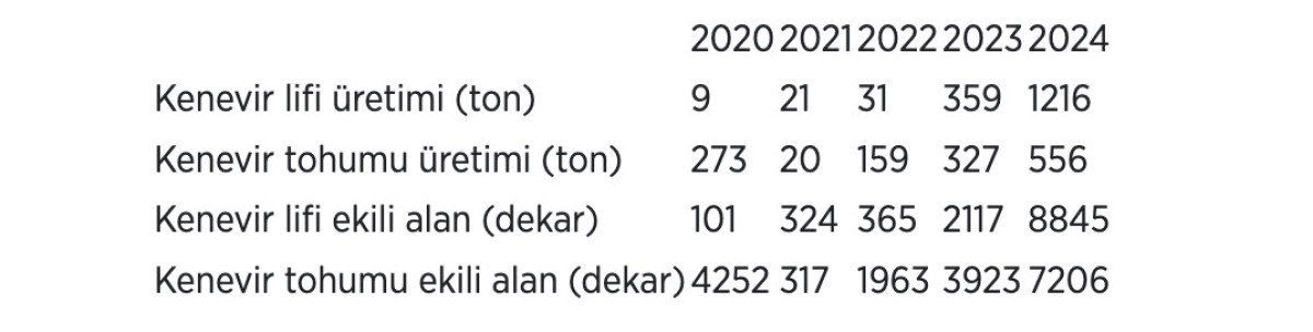 Son 5 yılda kenevir ekili alan ve üretimi şöyle: