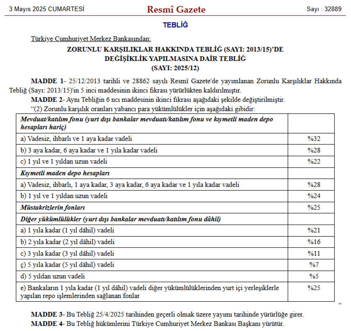 – Yurt içi yerleşiklerle yapılan, 1 yıla kadar vadeli yabancı para cinsi repo süreçlerinde sağlanan fonlar için mecburî karşılık oranı 400 baz puan artırıldı, ayrıyeten hesaplama usulü değiştirildi.